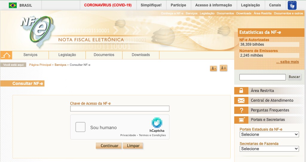 Com a chave de acesso da nota fiscal em mãos, o contribuinte deve acessar o site da Sefaz de interesse (como este, do estado de Mato Grosso) e preencher o campo com a sequência numérica, e confirmar que não é um robô por meio do CAPTCHA.