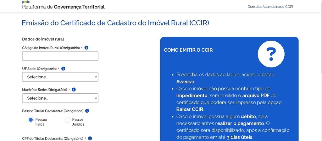 O documento pode ser emitido e impresso via on-line, por meio do portal do SNCR, ou, se necessário, em uma unidade física do órgão. Vale lembrar que o CCIR é atualizado anualmente e deve ser mantido em dia pelos proprietários ou responsáveis pelos imóveis rurais em todo o território nacional.