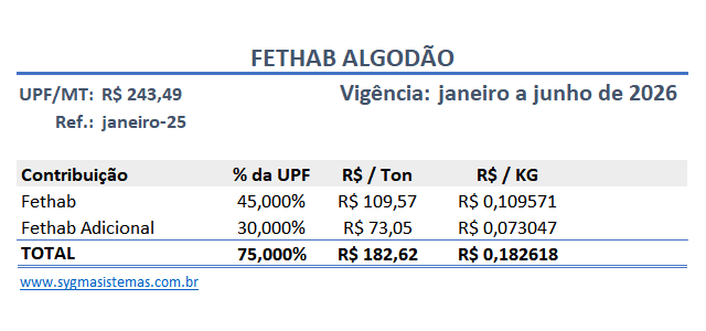 - Contribuição para o FETHAB de 45% do valor da UPF/MT vigente no período, por tonelada de algodão transportada;