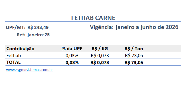 - Contribuição para a entidade da cadeia produtiva no valor de 1,26% do valor da UPF/MT vigente no período, por cabeça de gado;
