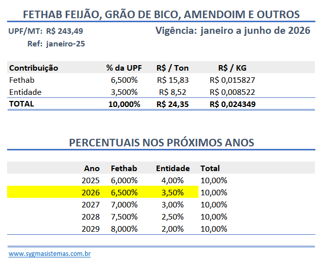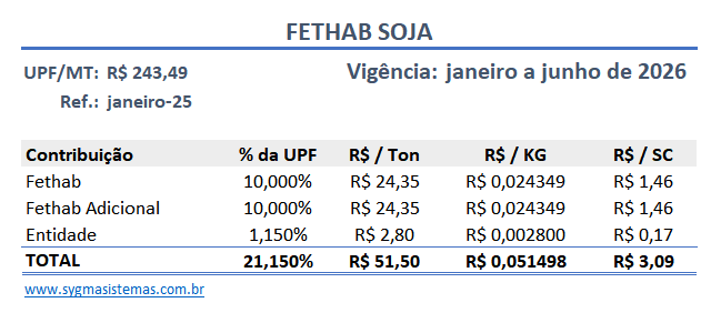 - Contribuição adicional para o FETHAB de 10% do valor da UPF/MT vigente no período, por tonelada de soja transportada, vigente até 31 de dezembro de 2026; (Art.7º-D-1 §3º da Lei 7.263/2000)