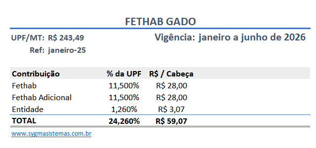 - Contribuição adicional para o FETHAB de 11,5% do valor da UPF/MT vigente no período, por cabeça de gado, vigente até 31 de dezembro de 2026; (Art.7º-D-1 §3º da Lei 7.263/2000)