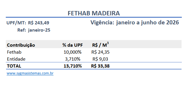 - Contribuição para a entidade da cadeia produtiva da madeira de 3,71% do valor da UPF/MT vigente no período, por metro cúbico;