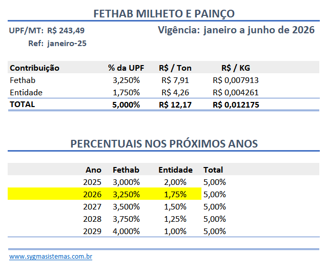 - Contribuição para o FETHAB de 3% do valor da UPF/MT vigente no período, por tonelada transportada;