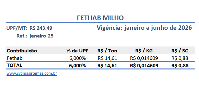 Para o Milho, o FETHAB MT incide apenas no transporte para fora do estado de Mato Grosso (MT) ou com destino à exportação, sendo de 6% do valor da UPF/MT vigente no período, por tonelada de milho transportado.