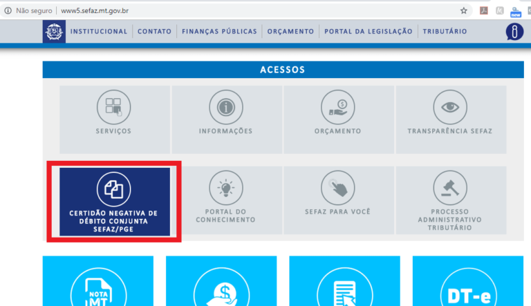Para emitir a certidão, o contribuinte deve acessar o site da SEFAZ MT e escolher a opção “Certidão Negativa de Débito conjunta SEFAZ/PGE” na página principal, como mostra a imagem abaixo: